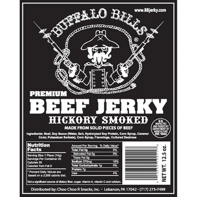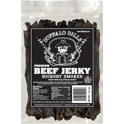 Our classic Buffalo Bills Premium Hickory “Hung in the Smokehouse” Beef Jerky Strips in a 12.5oz bag. Introduced in 1990, our Premium Hickory Beef Jerky is the product our company was founded upon. Marinated in soy sauce, garlic, and black pepper, this mildly flavored whole muscle beef jerky is still our #1 selling product after all these years. Proudly made in the USA with 100% US-raised beef. Our line of Buffalo Bills Premium Beef Jerky is available in 6 distinct flavors – Hickory, Maple Pepper, Black Pepper, Beer (beef jerky marinated in a Honey Brown Ale), Chesapeake, and Reaper.