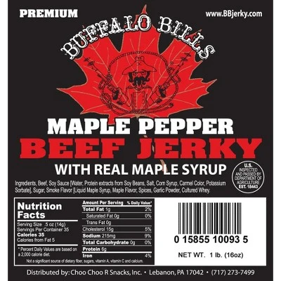 One full pound of our Buffalo Bills Premium Maple Pepper Beef Jerky in random size pieces. Pieces vary in size from 1″ to 5″ in length. After vacationing in Vermont, Buffalo Bill came back with this enticing variation on our classic Premium Hickory beef jerky. Using real maple syrup with an added bite of cracked black pepper, this inspired flavored combo is sure to create a new wave of jerky cravings! Please note the “Real Maple Syrup” showing on the front of the package qualifies as an “included ingredient” by the USDA – this is why it is not mentioned again in the ingredient statement. Our line of Buffalo Bills Premium Beef Jerky is available in 6 distinct flavors – Hickory, Maple Pepper, Black Pepper, Beer (beef jerky marinated in a Honey Brown Ale), Chesapeake, and Reaper.