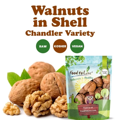 – GROWN IN THE USA, PROLONGED FRESHNESS: Chandler Jumbo Walnuts in Shell by Food to Live are proudly grown and packaged in sunny California. Thanks to its protective shell, these nuts maintain their freshness for longer. Food to Live is proud to offer Chandler Jumbo Walnuts in Shell for sale. Grown in sunny California, Jumbo Chandler Walnuts variety is valued for its impressive big size and outstanding flavor. If you wonder what’s the difference between Chandler Walnuts vs English Walnuts, the Chandler variety is actually a type of English Walnuts that has its distinct features. Our Large Whole Walnuts are of Premium Quality, 100% Raw, Vegan, Keto and Paleo diets-friendly, Kosher, and made in the USA.Nutritional Value of Chandler Walnuts in ShellJumbo Chandler Walnut benefits are linked to their exceptional Nutritional Profile. First and foremost, Jumbo Walnuts are a powerhouse of Omega-3 fatty acids. Second, Fresh Walnuts in Shell provide a great amount of dietary fiber and plant protein, being a wonderful addition to a Vegan or Vegetarian diet.Furthermore, Whole Walnuts in Shell are rich in potent antioxidants named polyphenols which fight free radicals. Chandler Walnuts California are a source of various vitamins and minerals including Copper, Iron, Magnesium, Vitamin B6, Zinc, Manganese, Phosphorus, and Folate.Ways to enjoy Jumbo Chandler Walnuts in ShellTo savor these delicious walnuts, you need to shell them first. You can either do it with a nutcracker or a hammer. Once shelled, Chandler Jumbo Walnuts present with a yummy combination of creamy, slightly crispy texture and a rich nutty flavor. Munch on Chandler Walnuts whenever you crave a snack or need a boost of energy. They make an amazing substitute for high-sodium popcorn and potato chips.What’s more, you can sprinkle Jumbo Walnuts over oatmeal, porridge, cereals, smoothies, avocado toasts, salads, and ice cream. Besides, Chandler Walnuts are an excellent pastry and confectionary ingredient. Use them when baking cakes, cookies, brownies, breads, or making sweets, desserts, and granola bars