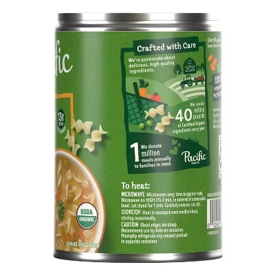 Immerse your taste buds into Pacific Foods Organic Chicken Noodle Soup. This organic soup has tender organic chicken, chicken broth, hearty egg noodles and garden vegetables. Enjoy it on its own as a quick and easy snack, customize it with your favorite toppings or pair soups with a salad, sandwich or wrap. USDA Certified Organic and made with non-GMO ingredients, this organic chicken soup contains 13 grams of protein per can and is made with no MSG, high fructose corn syrup, artificial colors or artificial flavors.