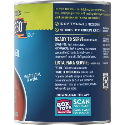 Progresso Vegetable Classics Tomato Basil Soup is a classic tomato soup packed with heartwarming goodness. It’s great for days when you crave an easy mealtime addition or want to warm up from the inside out. Whether it’s part of a delicious lunch or dinner, add Progresso canned soups to your shopping list as a favorite comfort food. This gluten free canned soup contains one-half cup of vegetables per serving, and no artificial flavors or colors from artificial sources. Unlike instant ramen, Progresso Soup is ready to serve, no need to add water. Just heat in a microwave-safe bowl in the microwave or in a saucepan on the stovetop. At Progresso, we’ve been creating soups, including favorites like Chicken Noodle, New England Clam Chowder, and Creamy Mushroom Soup, for more than 100 years. And today, Progresso still uses quality ingredients for a tasteful flavor found only in our line of canned soup products.
