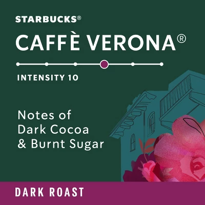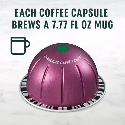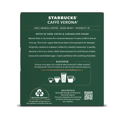 Enjoy the authentic cafรฉ taste of Starbucks coffee at home like never before on Nespresso Vertuo Machines. Made with the premium-quality Starbucks coffee that you know and love, Starbucks by Nespresso capsules are developed with Nespresso to work perfectly with the Nespresso Vertuo system and are fully recyclable through the Nespresso recycling program. Each cup of Starbucks Caffรจ Verona dark-roast coffee is well-balanced and full-bodied with notes of dark cocoa and caramelized sugar. Each precision-brewed Starbucks coffee is made with 100% arabica coffee beans. Authentically delicious perfection is just a cup away. Nestlรฉ uses Starbucks trademarks under license. NESPRESSO is a registered trademark of Sociรฉtรฉ des Produits Nestlรฉ S.A., Vevey, Switzerland. NET WT 3.52 OZ (100 g) each