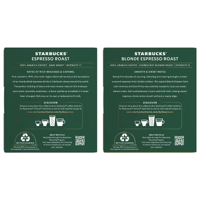 Enjoy the authentic café taste of Starbucks coffee at home like never before on Nespresso Vertuo Machines. Made with the premium quality Starbucks coffee that you know and love, Starbucks capsules are developed with Nespresso to work perfectly with the Nespresso Vertuo system and are fully recyclable through the Nespresso recycling program. Starbucks Espresso Roast has notes of rich molasses and caramel, while Starbucks Blonde Espresso Roast features smooth and sweet notes. Both are perfect for making oh-so-delicious espresso drinks. Each precision-brewed Starbucks coffee is made with 100% arabica coffee beans. Authentically delicious perfection is just a cup away. Nestlé uses Starbucks trademarks under license. NESPRESSO is a registered trademark of Société des Produits Nestlé S.A., Vevey, Switzerland. NET WT 2.39 OZ (68 g) each
