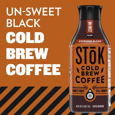 - PLENTY TO GO AROUND: One 48 fl oz bottle of ready to drink Unsweetened, Black, SToK Espresso Blend Cold Brew Coffee, 195 mg caffeine per 12 oz serving