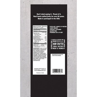 Wild Bill’s Original Hickory Smoked Beef Jerky 6.5oz Packs contain the exact same jerky as the Wild Bill’s strips, just cut into smaller pieces. Each unit includes 3 resealable 6.5oz packs of whole muscle beef jerky marinated in soy sauce and seasonings, then hand hung on rods and hickory smoked to perfection in a real smokehouse. Wild Bill’s Original Hickory Smoked Beef Jerky has only 2 carbs and 70 calories per 1oz serving – gluten free and contains no MSG.