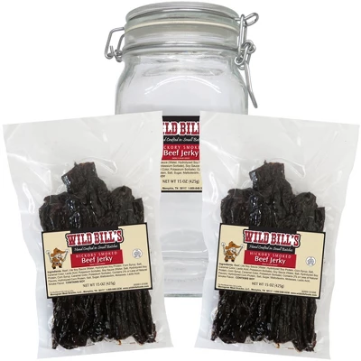 - Includes two 15oz bags of Wild Bill’s 30-ct Original Hickory Smoked Beef Jerky Strips